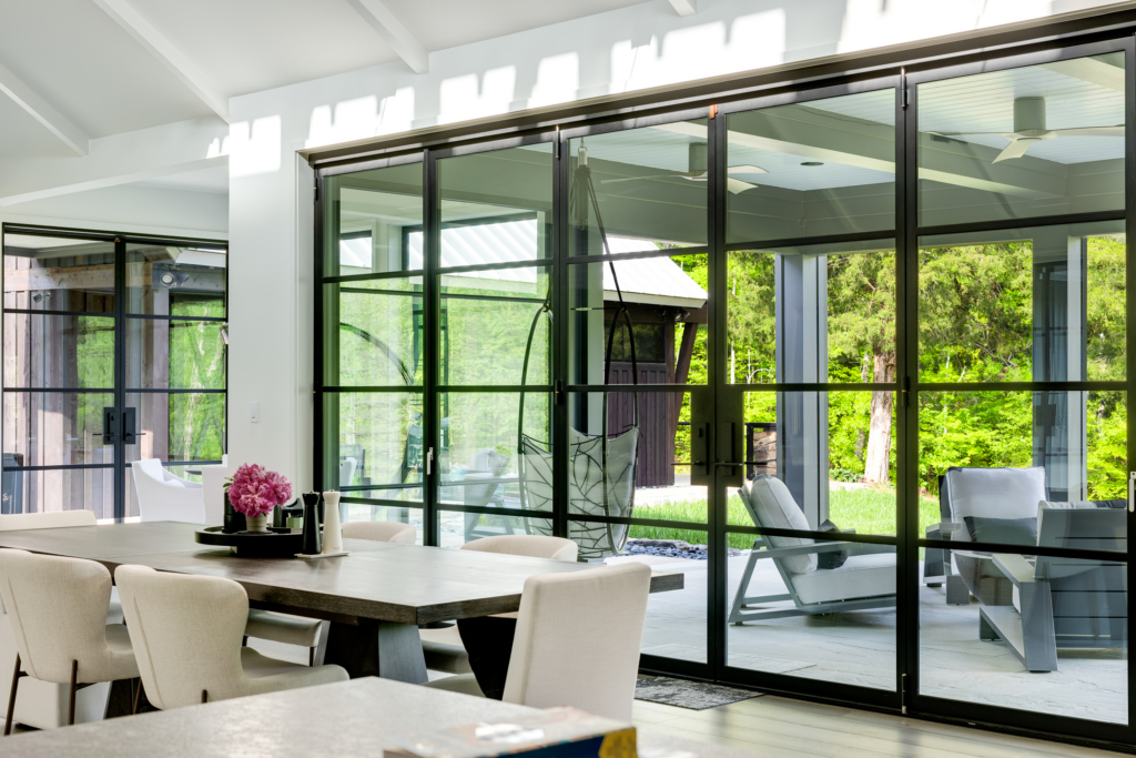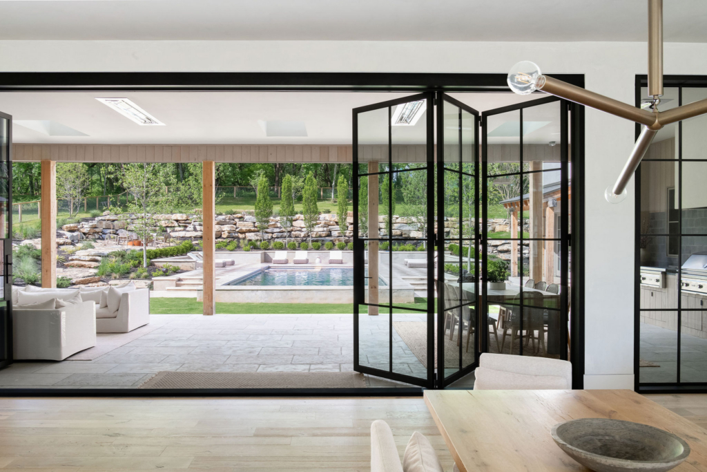 Steel-framed accordion doors provide the structural strength needed for large openings while maintaining clean sightlines and refined aesthetics.